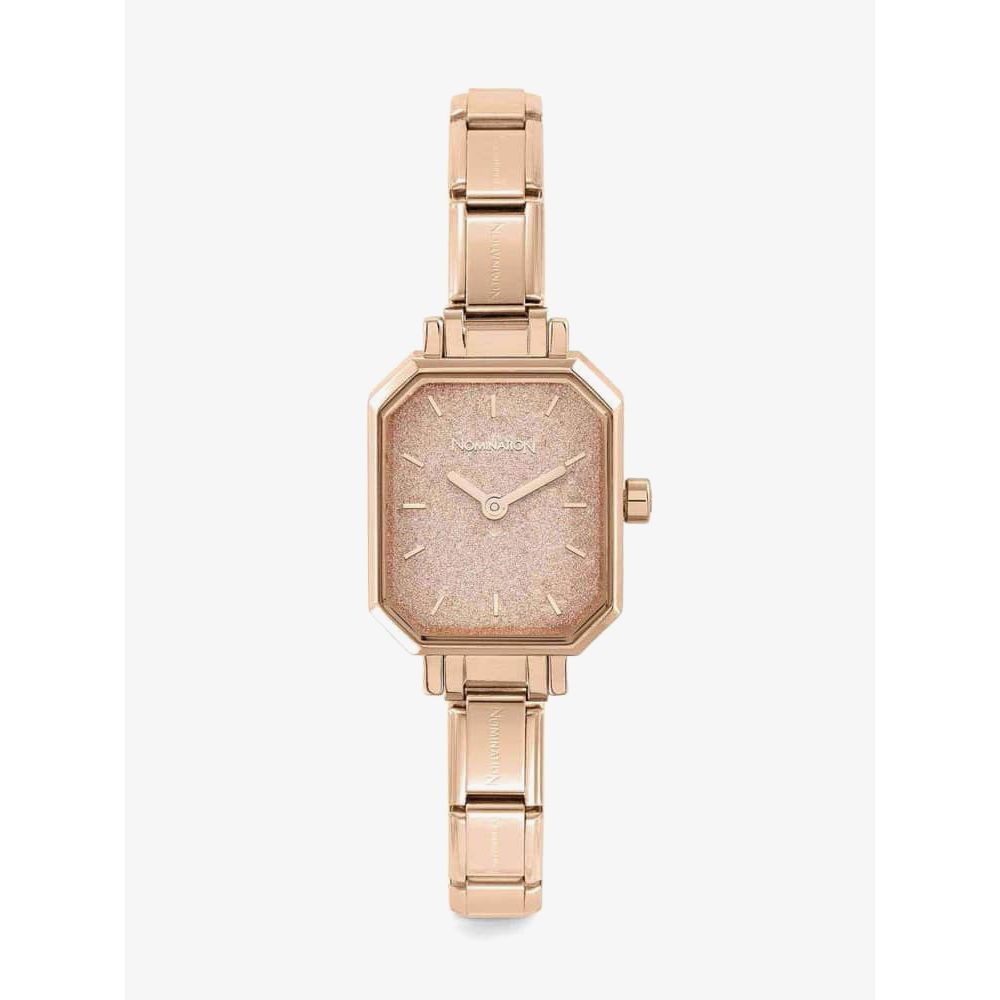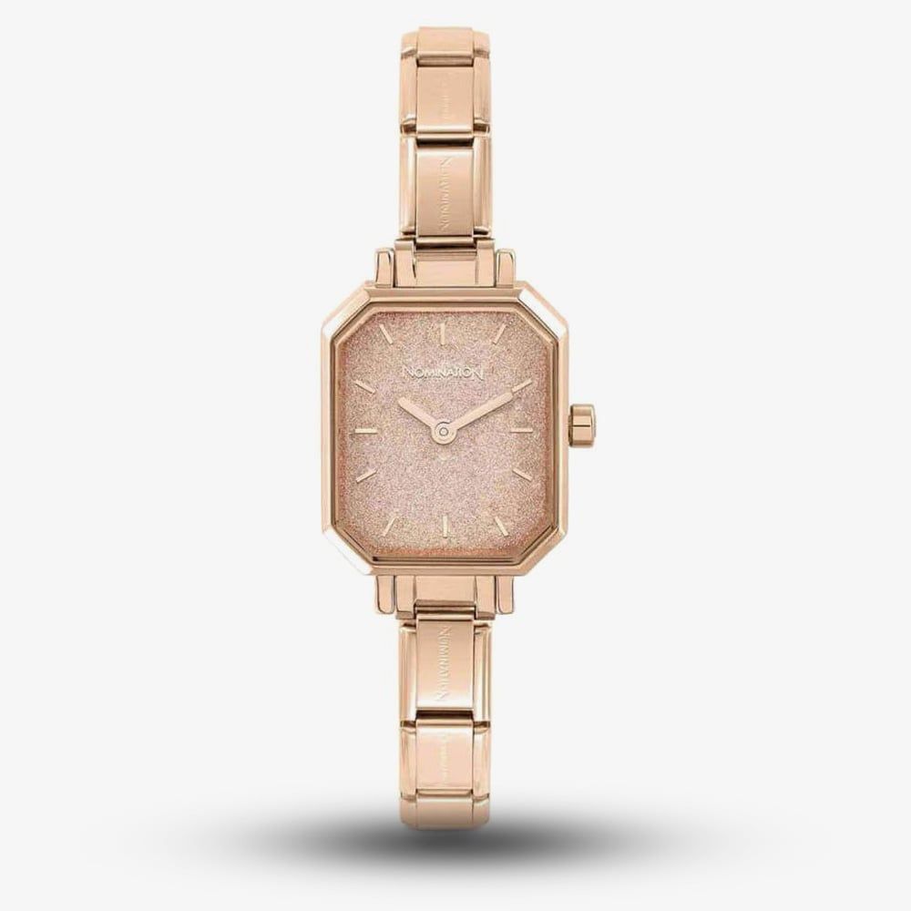 A beautiful pink glitter dial crafted in a rectangular stainless steel case with rose gold plating, finished on the composable bracelet which is ideal for collecting the CLASSIC charms to suit your mood or outfit.