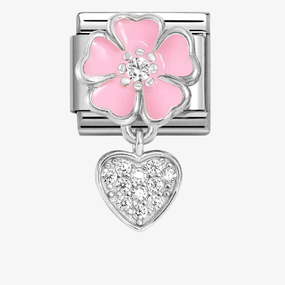 Adorned with a delicate pink enamel flower, exuding grace and femininity, this charm captures the essence of beauty. Dangling below is a heart filled with sparkling cubic zirconias, adding a touch of glamour and elegance to the design.