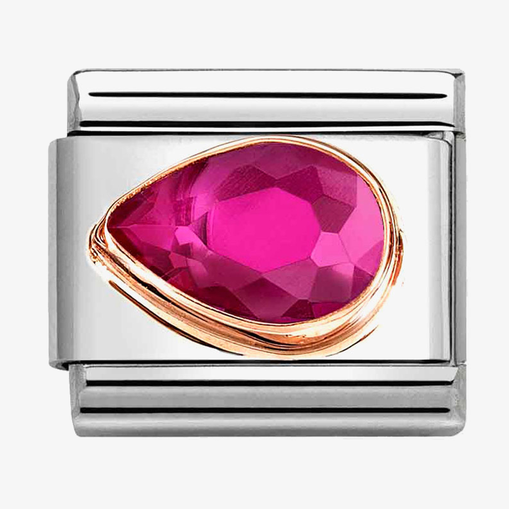 The Nomination CLASSIC charm is crafted from a stainless-steel base featuring a teardrop-shaped cubic zirconia stone in a captivating shade of pink, delicately outlined in 9ct rose gold.