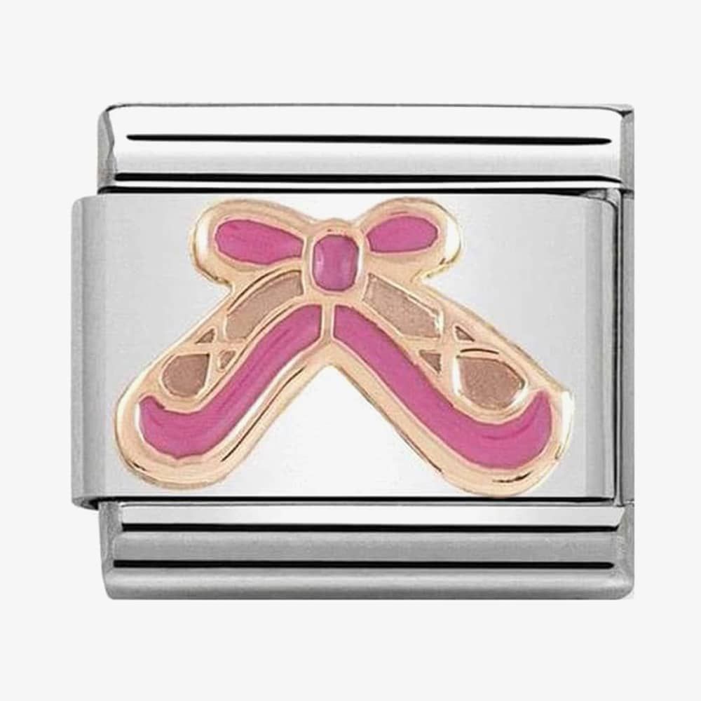 A stainless steel link for the original composable CLASSIC bracelet crafted with a 9ct Rose Gold Ballet Shoes symbol finished with pink enamel, ideal for the dance lover in your life.