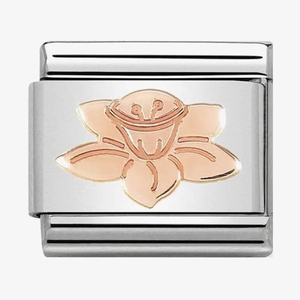 Celebrate Cymru heritage with this beautiful daffodil engraved link charm. The charm features a single daffodil in 9ct rose gold.
