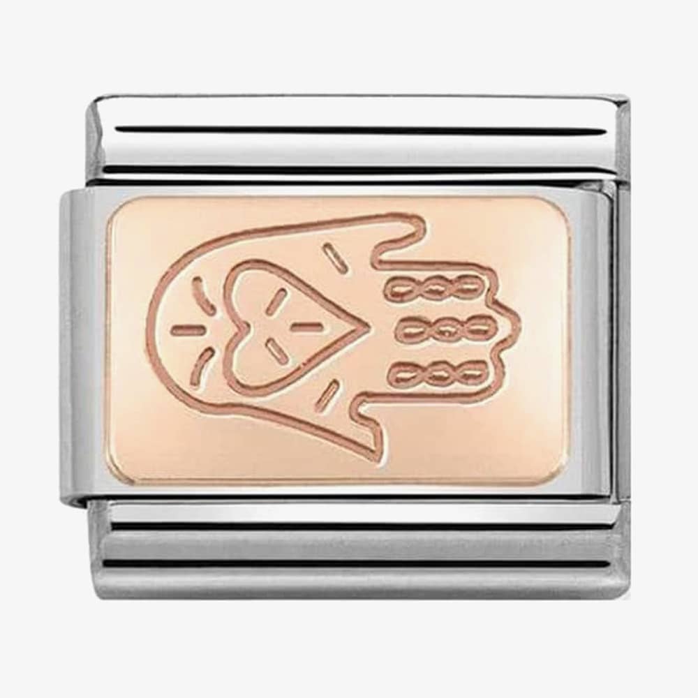 A stainless steel classic composable charm from Nomination. The charm features a 9ct rose gold detail that features a Hand Of Fatima engraving.