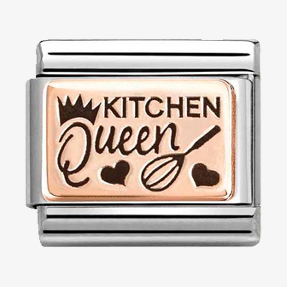 Celebrate culinary prowess with this delightful stainless-steel charm, featuring an elegant 9ct rose gold plate and detailed black enamel engraving. Adorned with the empowering words "Kitchen Queen," accompanied by a whimsical whisk, regal crown, and charming hearts, this charm pays homage to the creative force and love that reign in the kitchen.