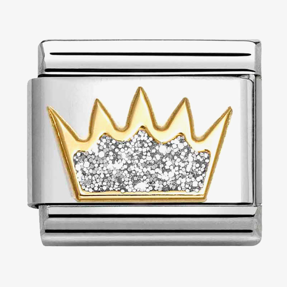 The Nomination CLASSIC charm is crafted from a stainless-steel base with an 18ct yellow gold crown set with silver enamel glitter. A stunning charm to add some sparkle to your bracelet.