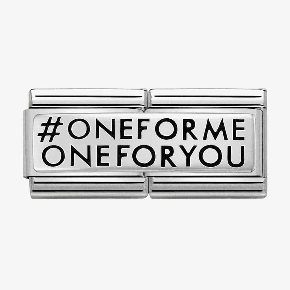 A double link crafted in sterling silver with the slogan #ONEFORMEONEFORYOU in black enamel text detail. #oneforyouoneforme