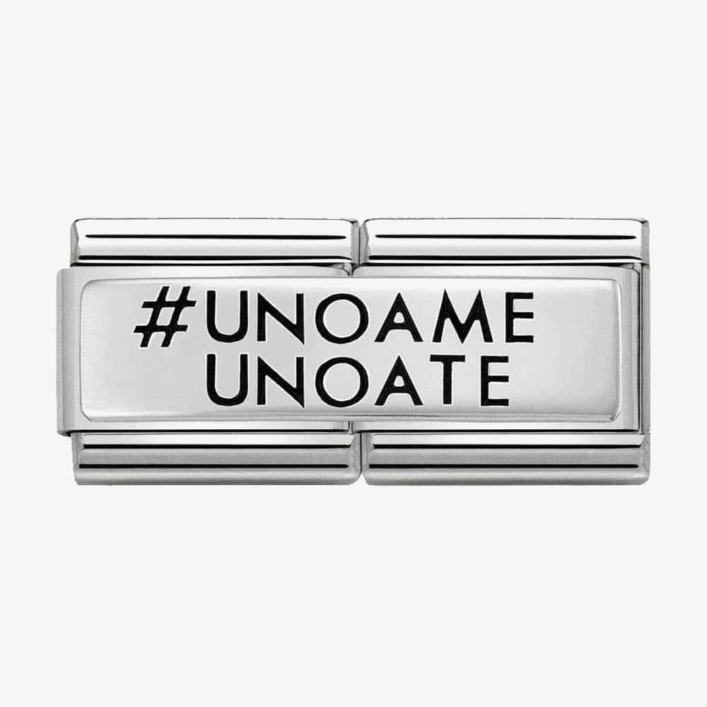 A double link crafted in sterling silver with the slogan #UNOAMEUNOATE in black enamel text detail. Meaning One for me, One for you in Italian. #oneforyouoneforme