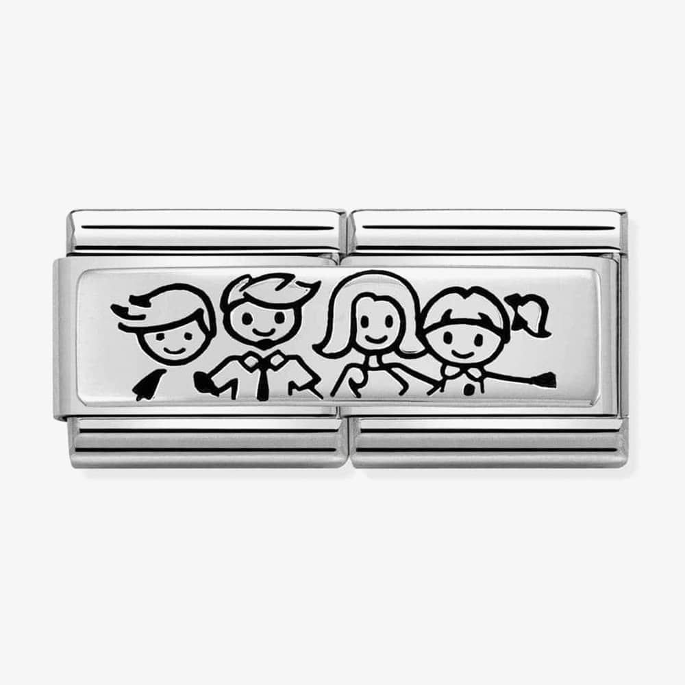 This perfect link to celebrate your family. Created in sterling silver, this double charm features a family with children motif. The perfect addition to your Composable bracelet.