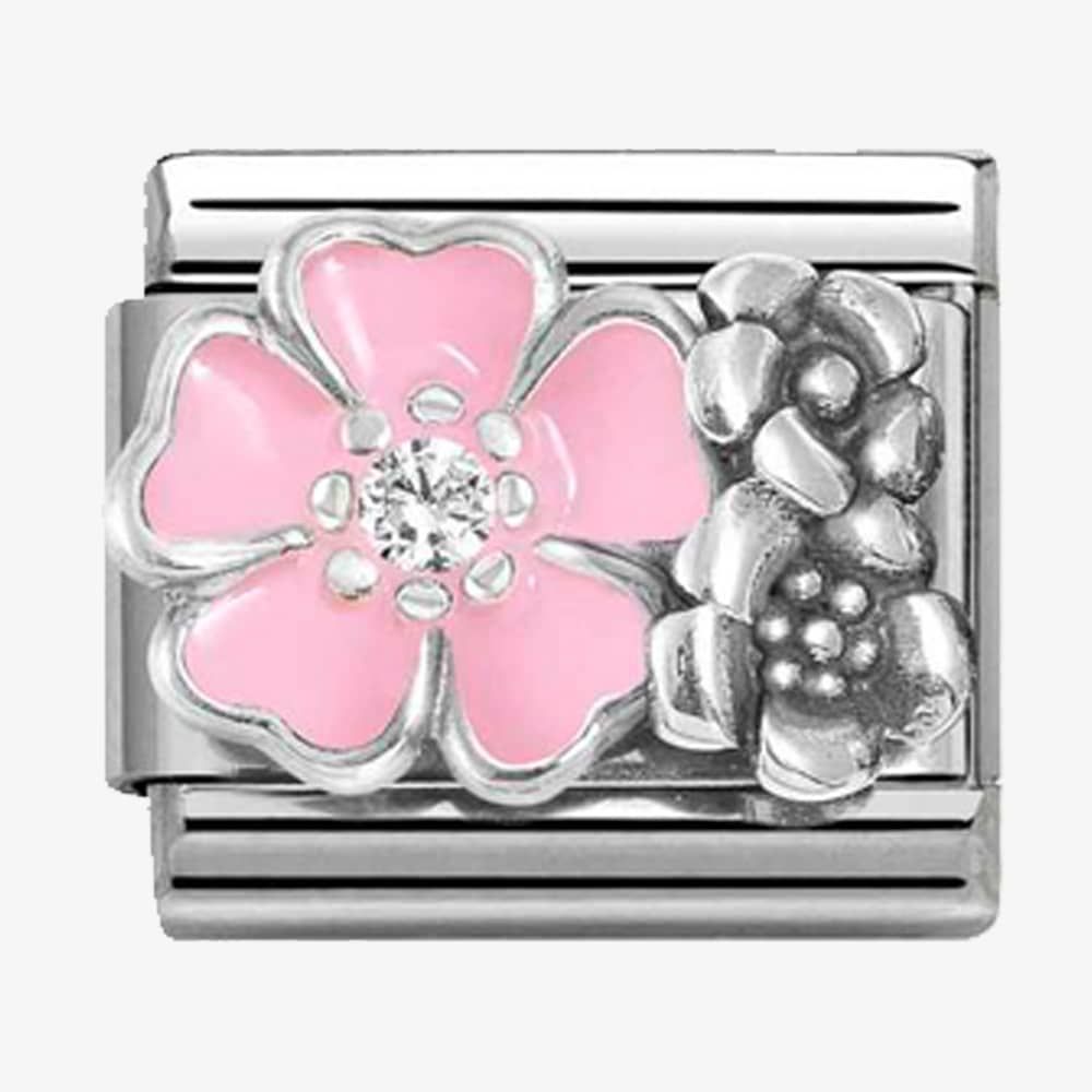 Embrace the beauty of nature with this charming stainless-steel charm adorned with delicate pink enamel flowers accented by two smaller oxidised sterling silver flowers. The combination of materials creates a captivating contrast, highlighting the charm's intricate design and adding depth to its floral motif.