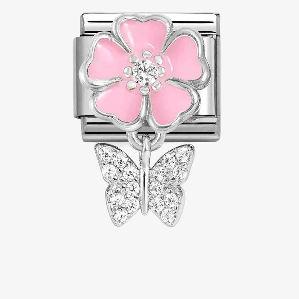 Add a touch of whimsical elegance to your collection with this charming stainless-steel charm. At its centre, a delicate pink enamel flower blooms, its beauty enhanced by a sparkling clear cubic zirconia nestled within. Below, a graceful butterfly, filled with shimmering cubic zirconia, hangs delicately, capturing the essence of freedom and transformation.