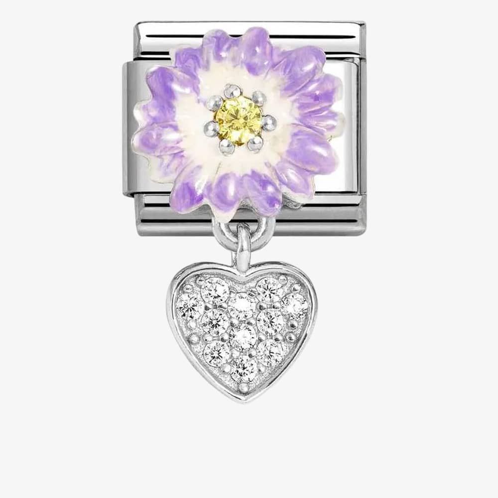Capture the essence of romance and femininity with this charming stainless-steel charm. At its core, a delightful purple and white enamel flower blooms, crowned by a radiant yellow cubic zirconia. Below, a heart filled with sparkling cubic zirconia dangles gracefully, symbolising love and affection.