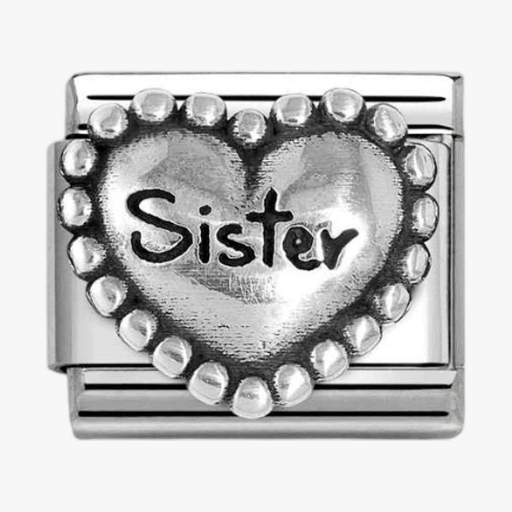 This Nomination Silvershine bracelet charm features a beaded heart design in stainless steel and sterling silver, with Sister elegantly written in black enamel at its centre. A heartfelt and stylish tribute, perfect for celebrating a special mother.