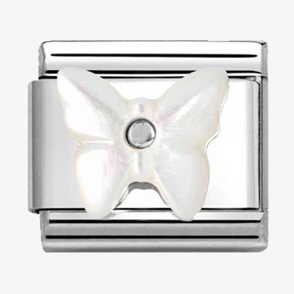 Elevate your style with the delicate elegance of this stainless-steel charm featuring a mother of pearl white butterfly. The iridescence of the mother of pearl adds a touch of ethereal beauty to the charm, while the butterfly symbolises transformation, renewal, and grace.