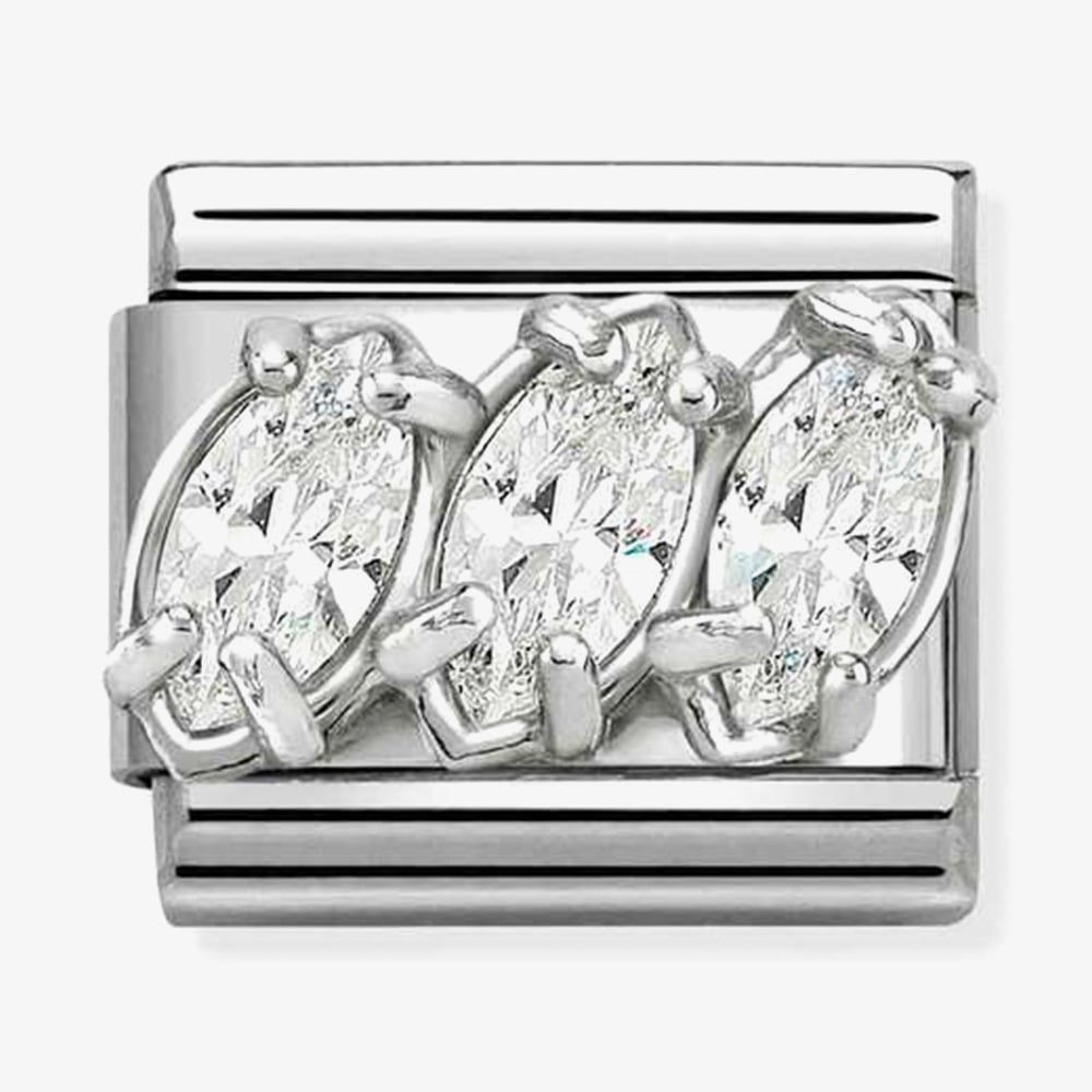 Add subtle elegance to your Nomination bracelet with this Classic Charm, crafted from stainless steel and sterling silver. The design features three white marquise-cut cubic zirconia stones, offering a refined sparkle and a timeless look. A graceful addition to any collection, perfect for everyday wear or special occasions.