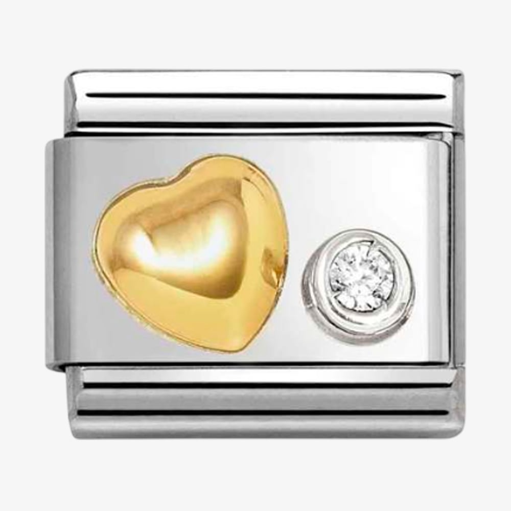 The Nomination CLASSIC stainless steel charm features an 18ct yellow gold heart and a sterling silver circle with a cubic zirconia stone set in sterling silver.. Combining durable stainless steel with a luxurious gold and silver design, this charm adds a touch of elegance and sparkle, perfect for those who appreciate fine craftsmanship.