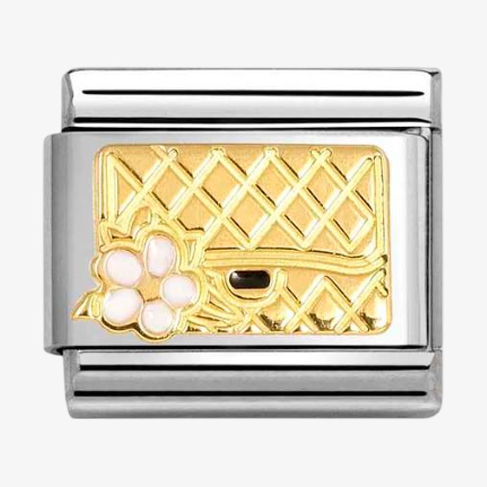 The Nomination CLASSIC Stainless Steel Charm features an elegant 18ct yellow gold handbag design adorned with a delicate white enamel flower. This stylish and versatile charm is perfect for adding a touch of sophistication to your bracelet.