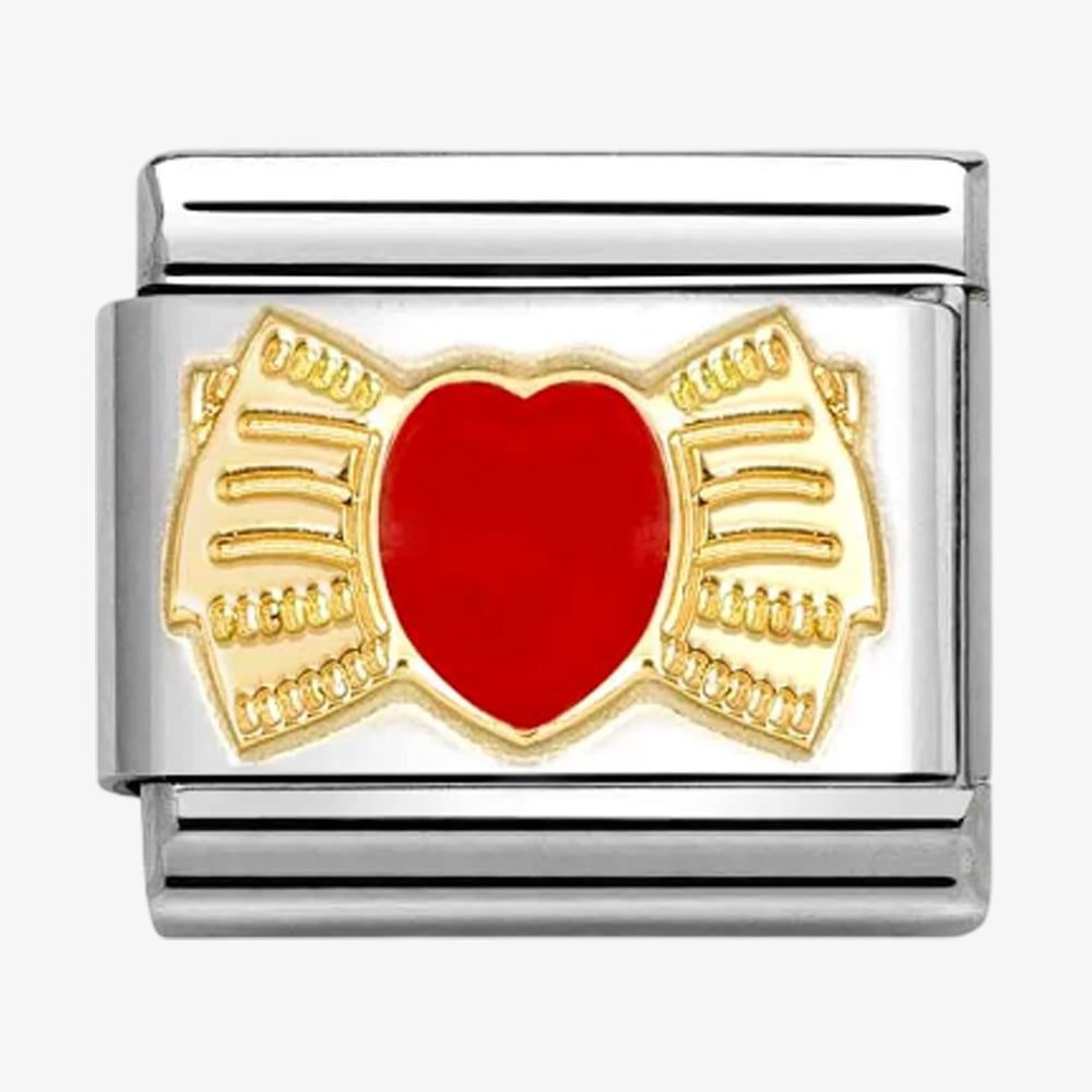 A chic stainless steel Nomination charm showcasing a vibrant red enamel bow, beautifully accented with 18ct yellow gold detailing. This elegant and whimsical design adds a touch of sophistication and charm to your bracelet.