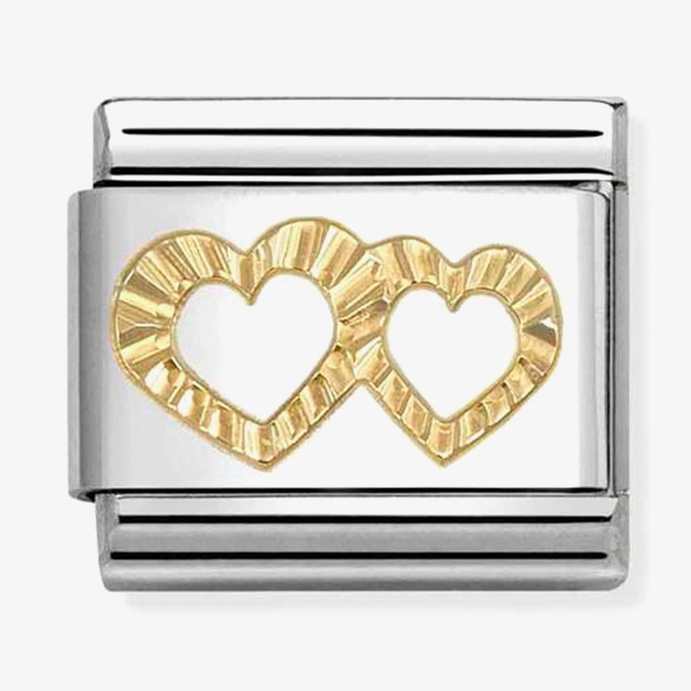 Timeless and meaningful, this Nomination Classic Charm is crafted from durable stainless steel and embellished with two diamond-cut hearts in bonded yellow gold. The finely detailed hearts reflect the light beautifully, symbolising love, unity, or a special connection. A perfect way to personalise your Nomination bracelet and commemorate cherished moments.