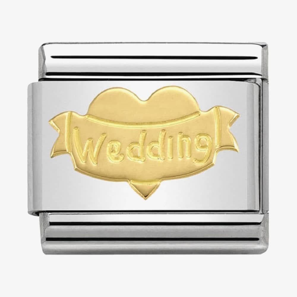 A classic looking Nomination charm which consists of a gold toned heart, wrapped in a ribbon with the word Wedding engraved. Add this to your bracelet today for extra style.