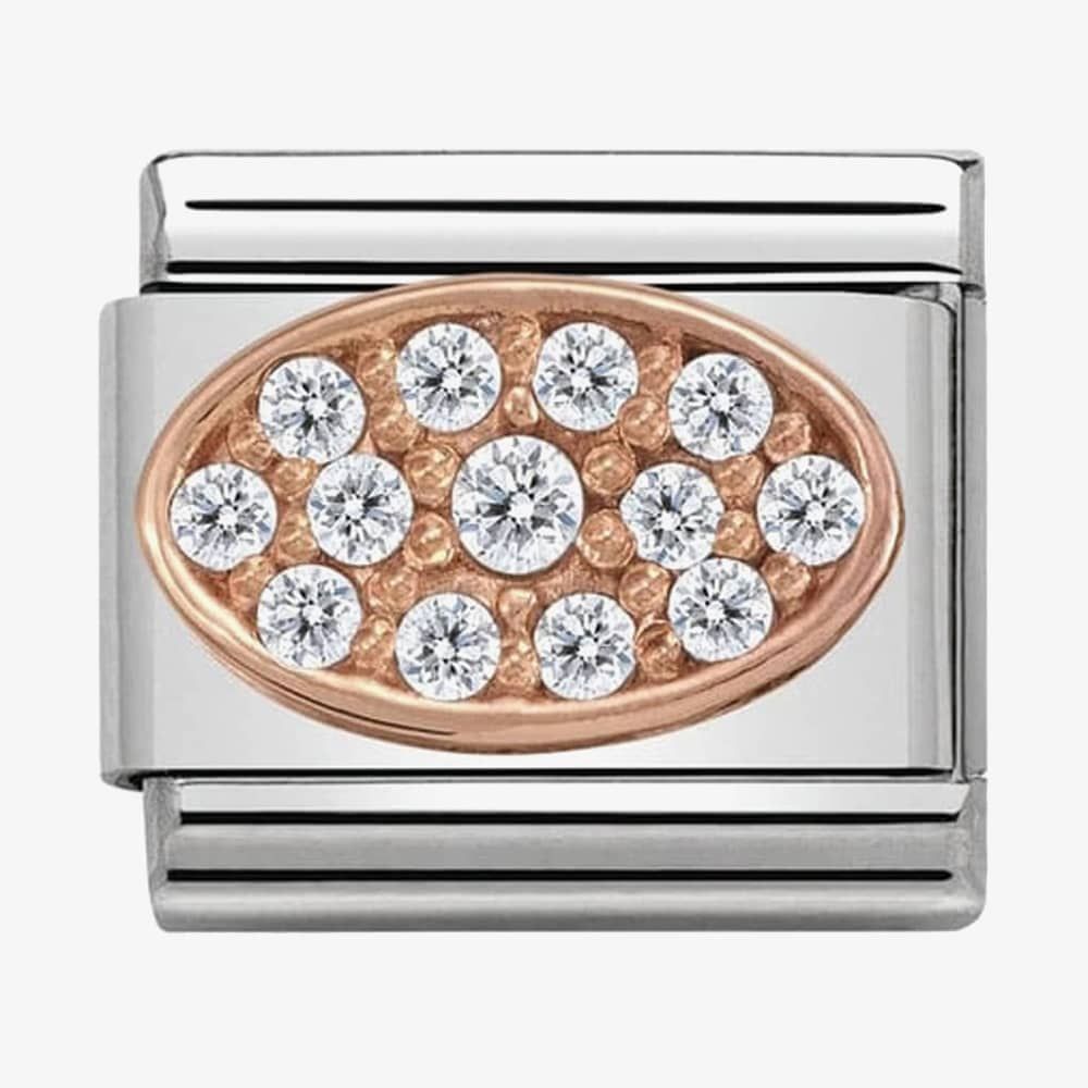 Adorn your outfit with this gorgeous charm from Nomination, suitable for any classic bracelet. The design features various white Cubic Zirconia crafted onto a stainless steel base with 9ct Rose Gold detailing.