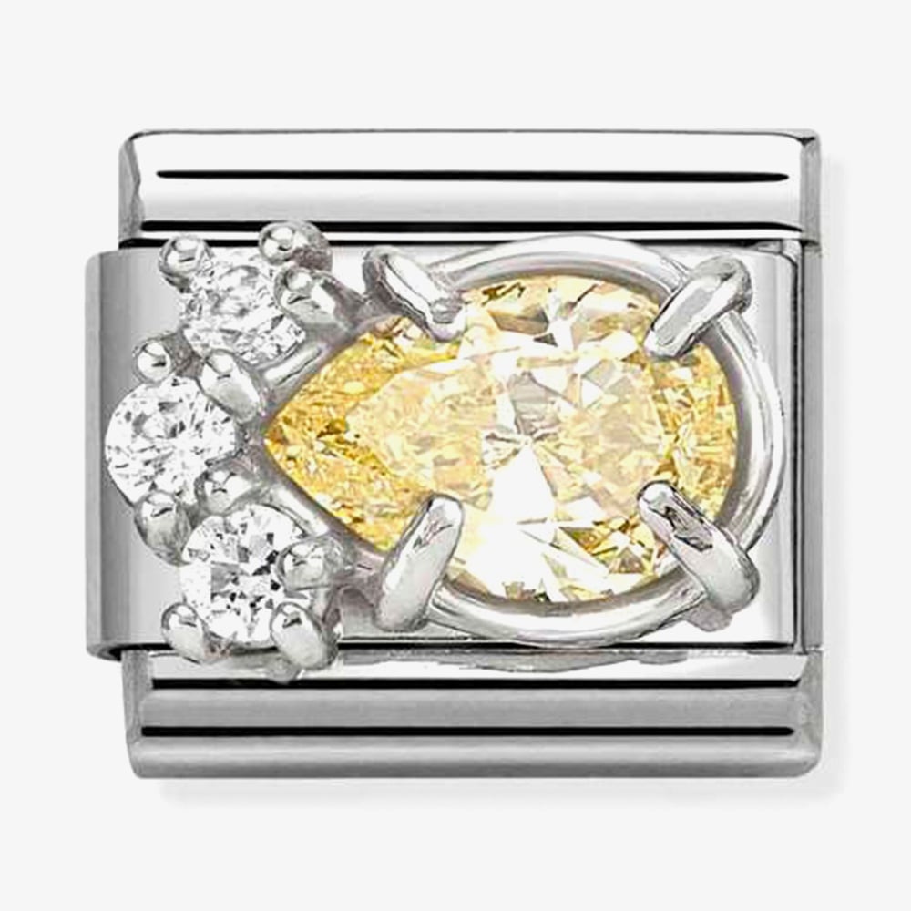 Add a warm splash of colour and elegance to your Nomination bracelet with this expertly crafted Classic Charm. Featuring a radiant yellow teardrop-shaped cubic zirconia set in stainless steel and sterling silver, complemented by three dazzling white stones, this charm offers a timeless and sophisticated touch to any collection.