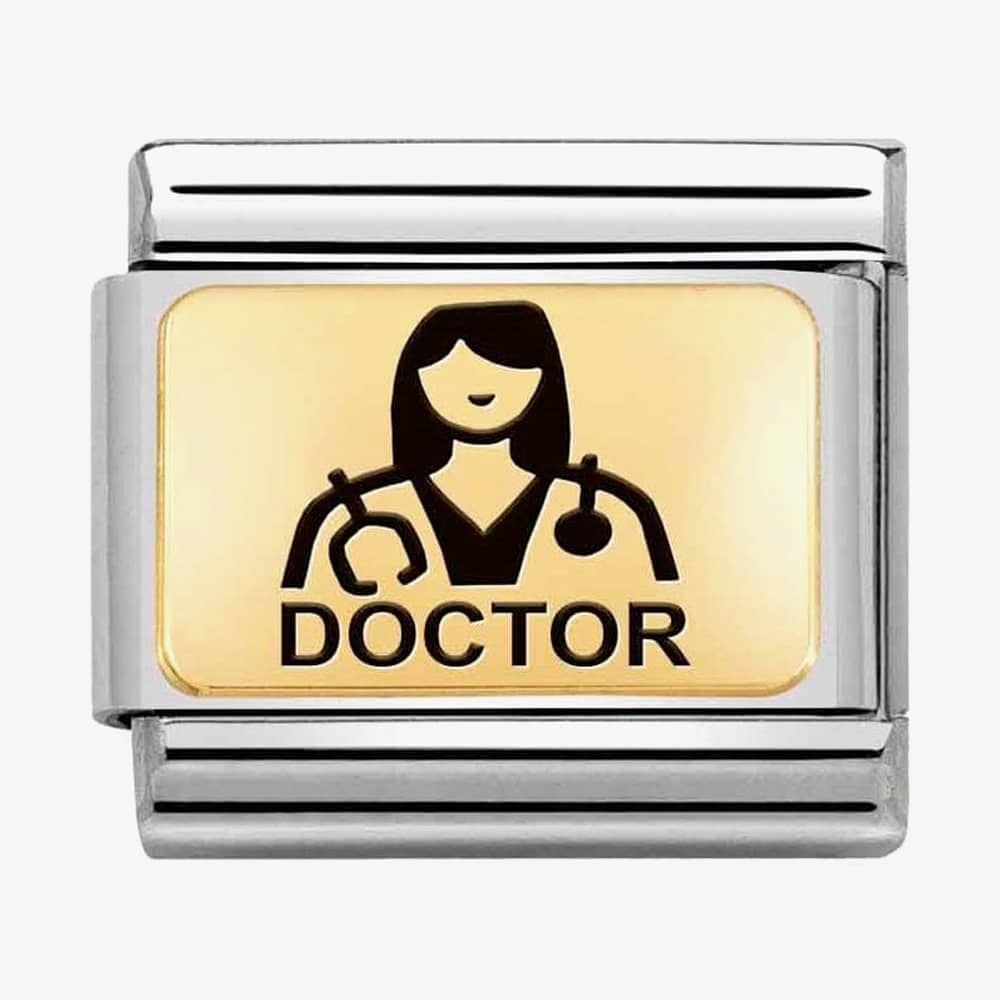 Nomination CLASSIC Composable charm 030166/25 features a bonded yellow gold plate with a female doctor design and black enamel detailing, set on a stainless-steel base.