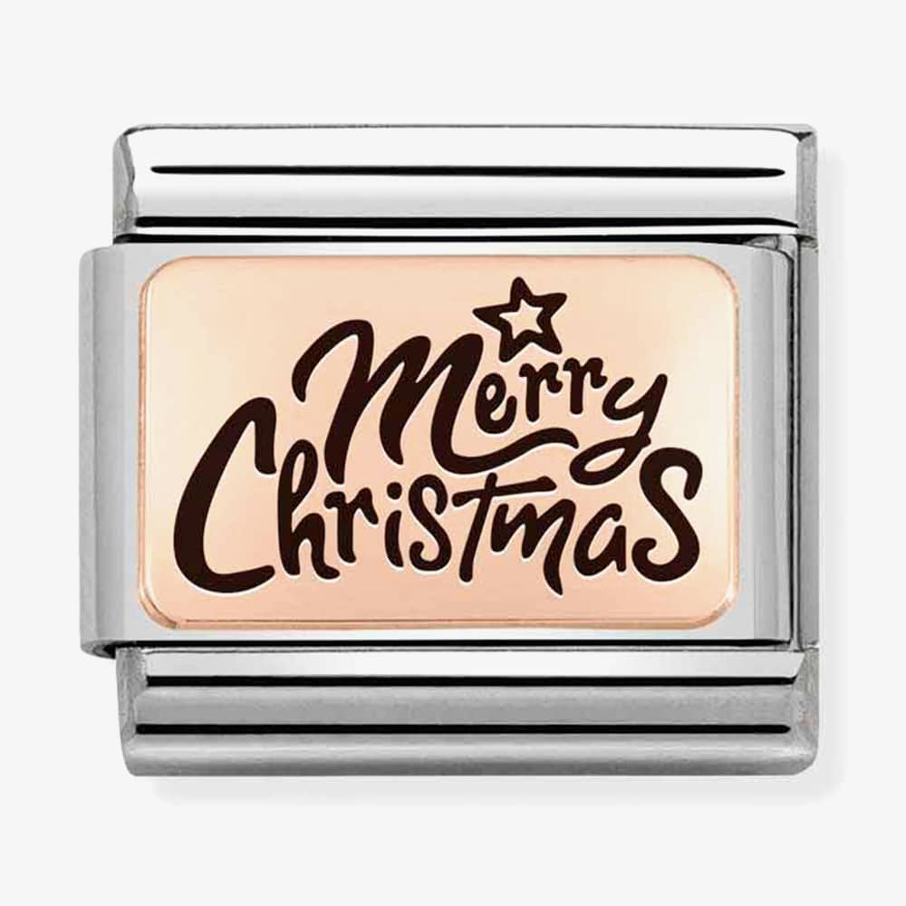 The Nomination Composable CLASSIC Plates Merry Christmas Charm 430111/14 features a bonded rose gold plate with the words 'Merry Christmas' and star detailing, on a stainless steel base.