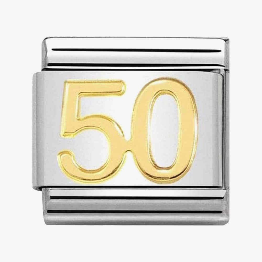 The perfect Nomination charm for that special anniversary, whether it is for someone's 50th birthday or a wedding anniversary. Consisting of a stainless steel link complete with a large gold tone number 50 in the centre.