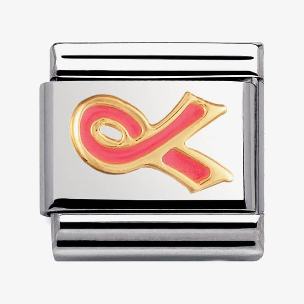 Show your support for people suffering from cancer and bring this inspiring charm to your Classic Nomination bracelet. A stainless steel link is adorned with luxurious 18ct gold and glossy pink enamel in the iconic pink ribbon design, marking the fight against cancer.