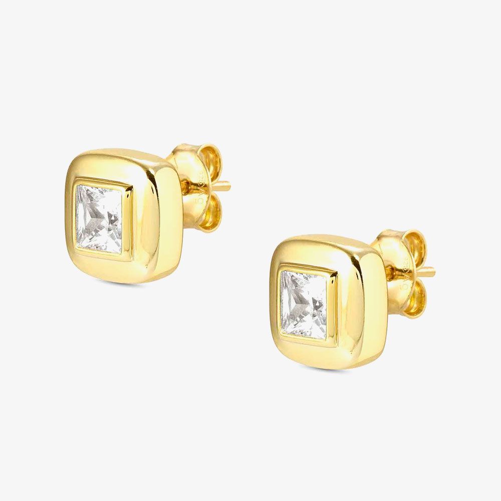 Discover elegance with Nomination's Domina Square Stud Earrings. Delicately crafted from sterling silver with yellow gold plating, adorned with pear-shaped white cubic zirconia stones, and securely fastened with a butterfly backing.