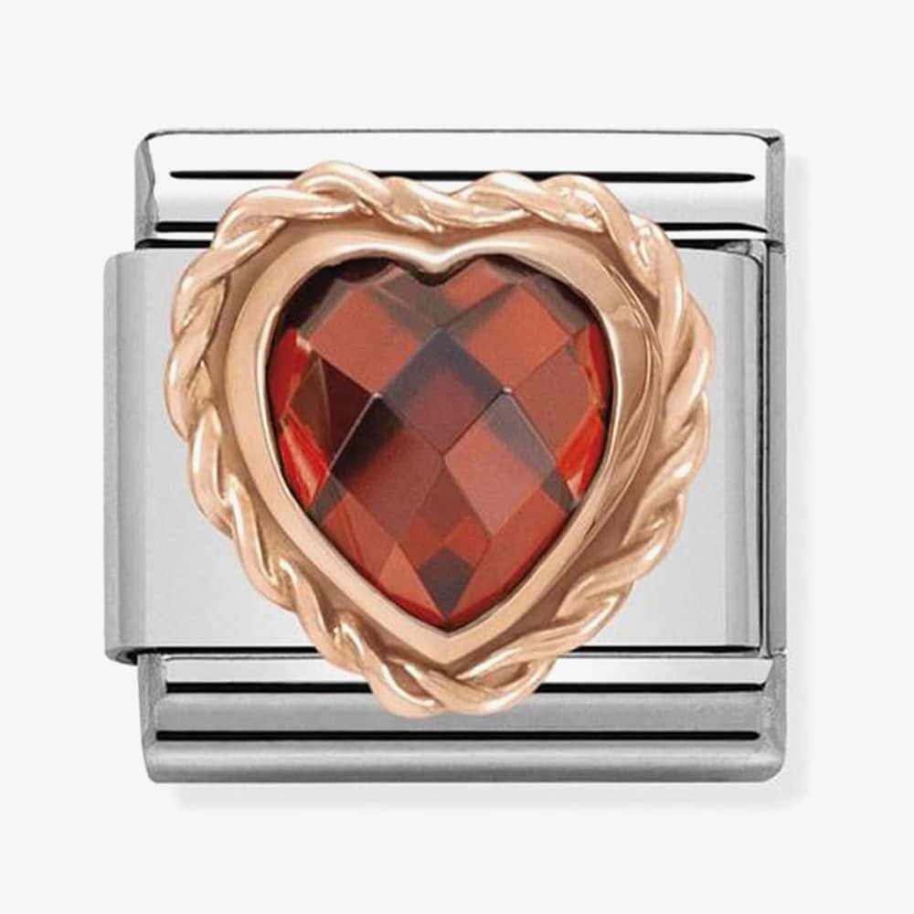 An attractive charm from Nomination featuring a rose gold tone outline with a red cubic zirconia heart. This charm is perfect for adding a touch of sparkle to your favourite Nomination bracelet.