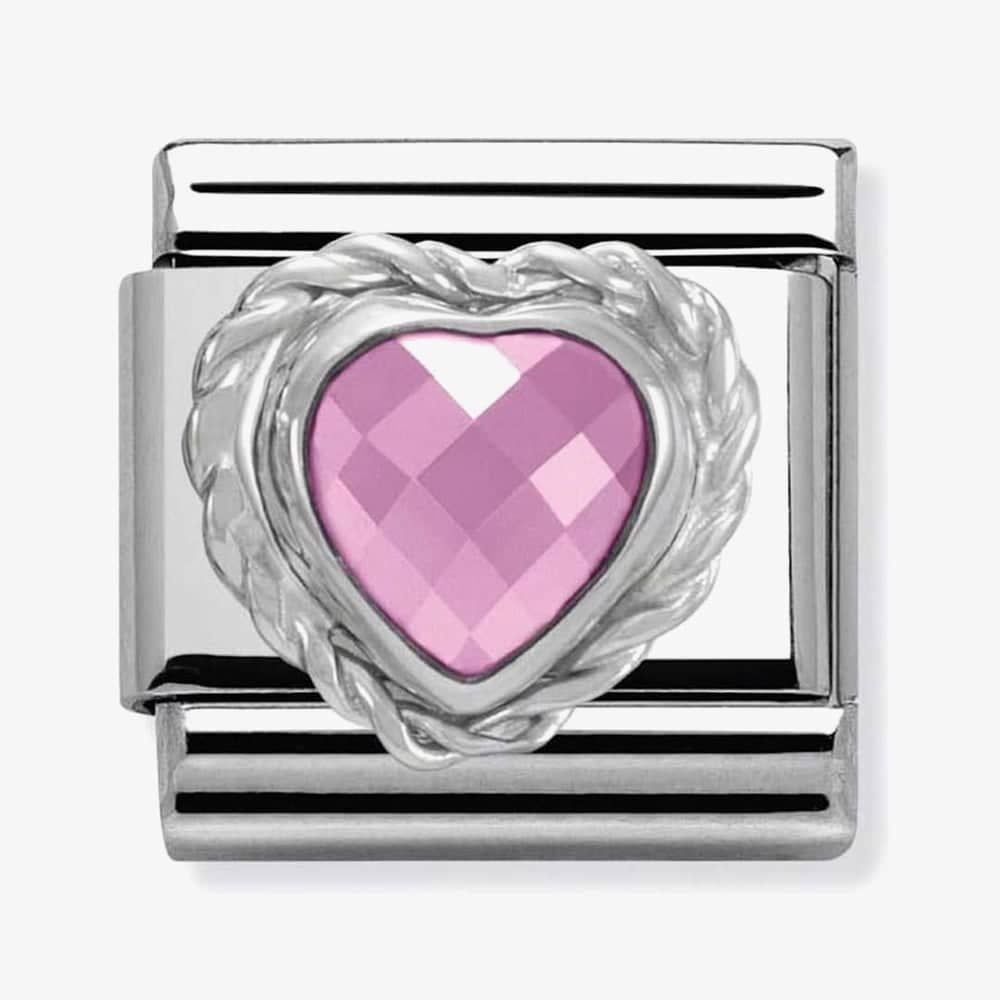 An attractive charm from Nomination featuring a stainless steel tile adorned with a pink cubic zirconia heart. This charm is perfect for adding a touch of sparkle to your favourite Nomination bracelet.