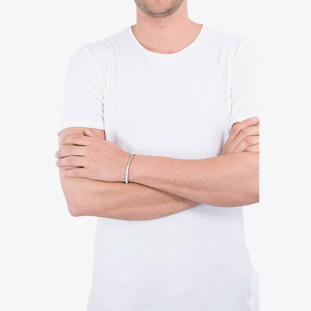 The Nomination Instinct White Agate Bead Bracelet 027902/042 is delicately crafted from stainless steel. This bracelet features stainless steel bead centre piece adorned with white agate beads on either side, emphasising the contrasting colours. It is adjustable in length, measuring 18cm to 21.5cm, with each gemstone measuring 0.45cm in diameter.