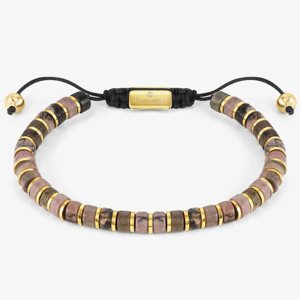 The Nomination InstinctStyle Rhodocrosite Bracelet 027927/087 features a yellow gold finish stainless-steel and rhodocrosite stone design which is threaded on a black drawstring cord. This bracelet is adjustable 15-21 cm and is ideal for layering and stacking with other Nomination bracelets to create your own unique look.