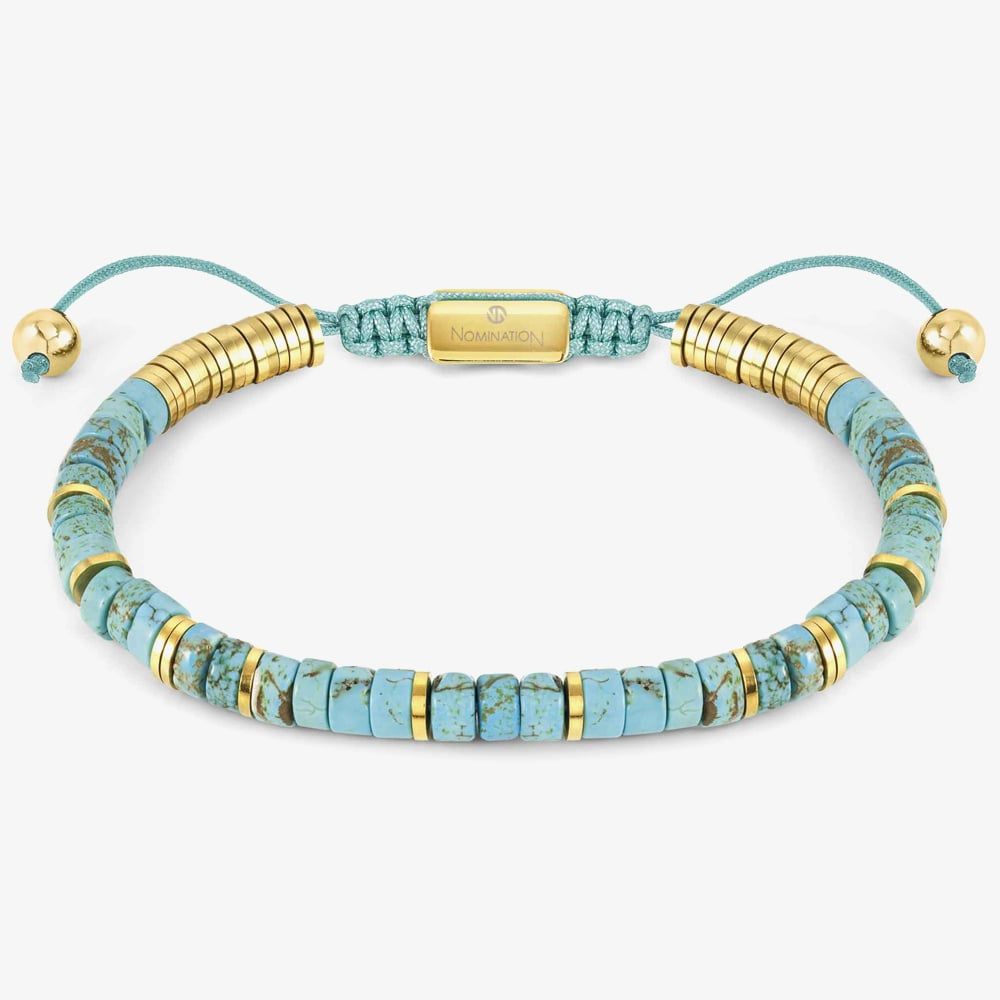 The Nomination InstinctStyle Turquoise Bracelet 027925/033 features a yellow gold finish stainless-steel and turquoise stone design which is threaded on a turquoise blue drawstring cord. This bracelet is adjustable 15-21 cm and is ideal for layering and stacking with other Nomination bracelets to create your own unique look.
