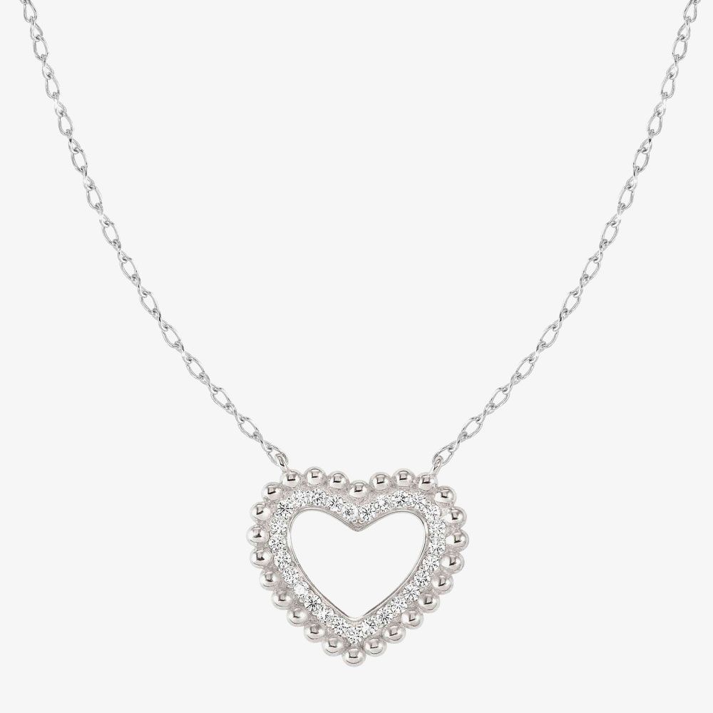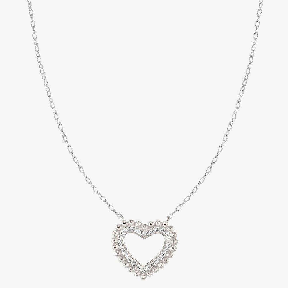 The Nomination Lovecloud Heart Silver Necklace is delicately crafted from sterling silver Suspended on an adjustable chain is a heart-shaped pendant adorned with white cubic zirconia pave stone and bead detailing, securely fastened with a lobster claw clasp. A symbol of love and elegance.