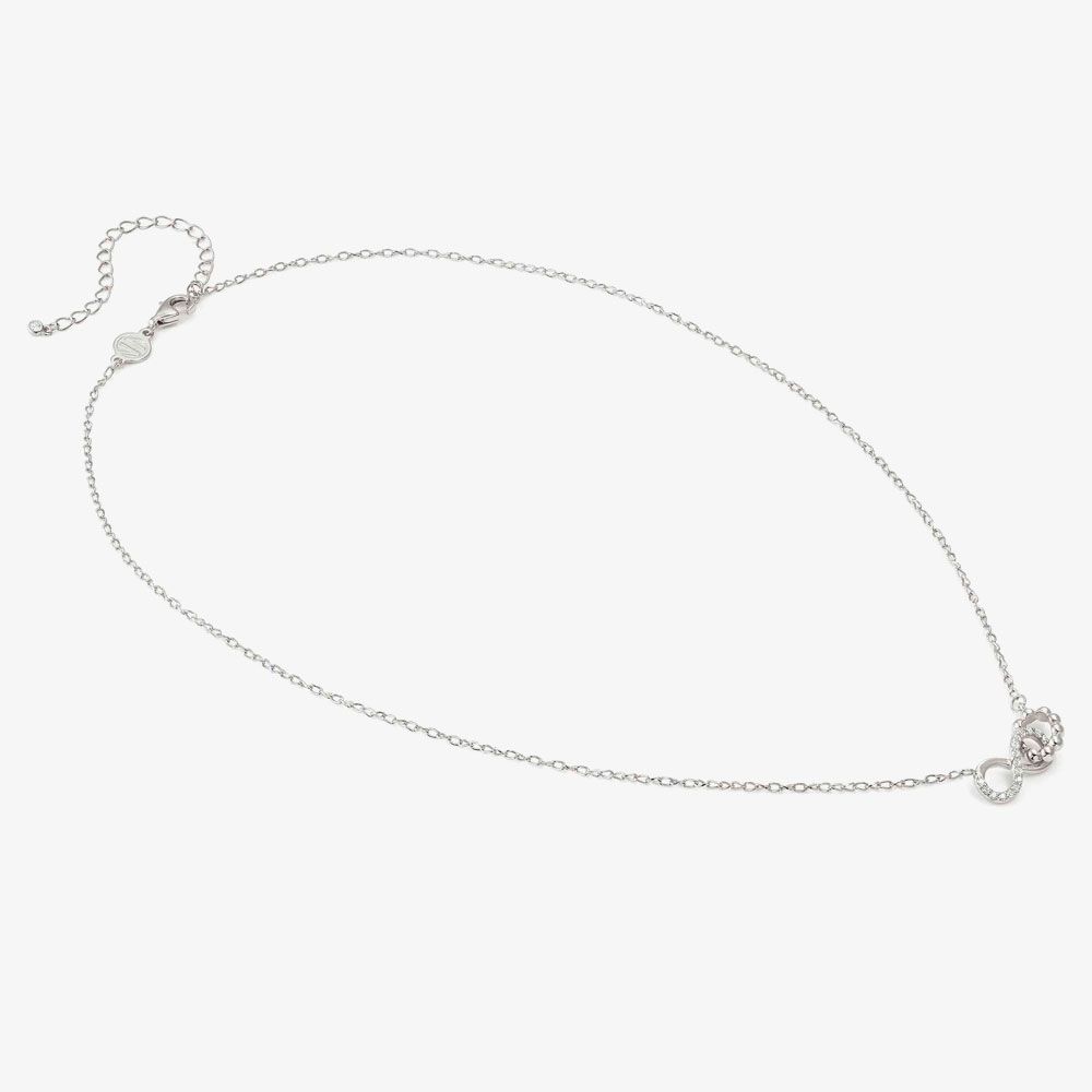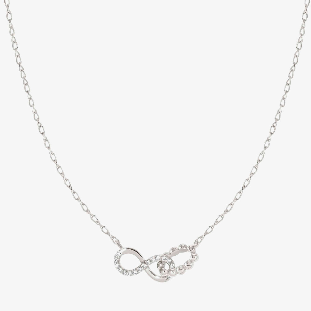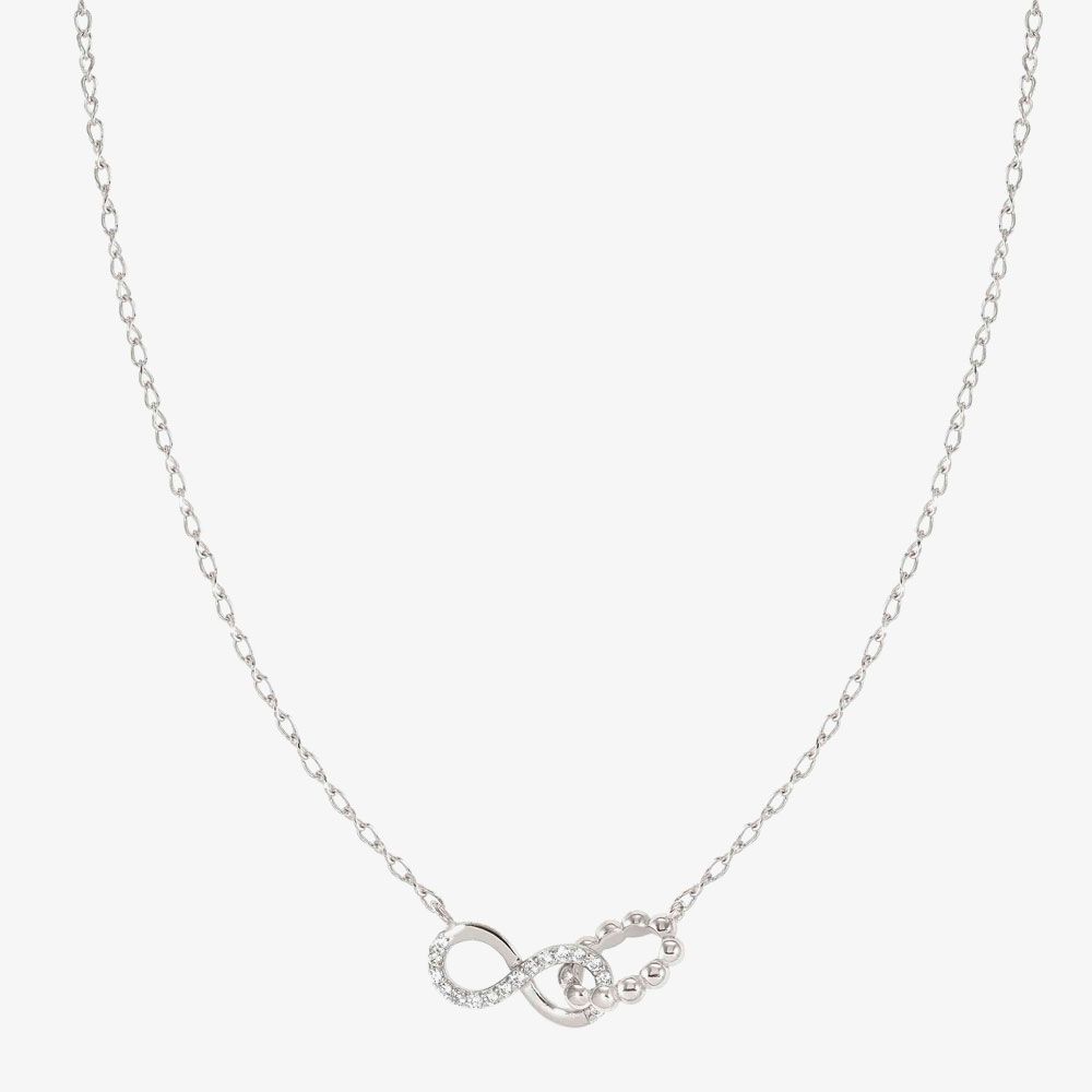 This necklace is crafted from sterling silver, it features an interlocking dotted circle and infinity sign, adorned with white cubic zirconia. Suspended on a belcher chain, this piece encapsulates enduring love and style.