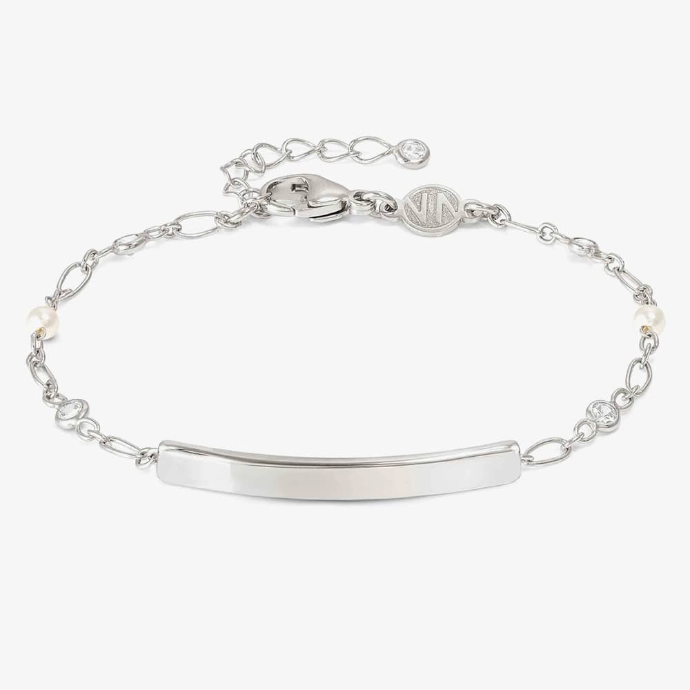 This sterling silver bracelet features a rectangular plate with cubic zirconia and pearl beads on the chain. Crafted for durability and elegance, it's a versatile accessory perfect for any occasion. Add a personal touch with engraving, making it a cherished keepsake or a heartfelt gift.