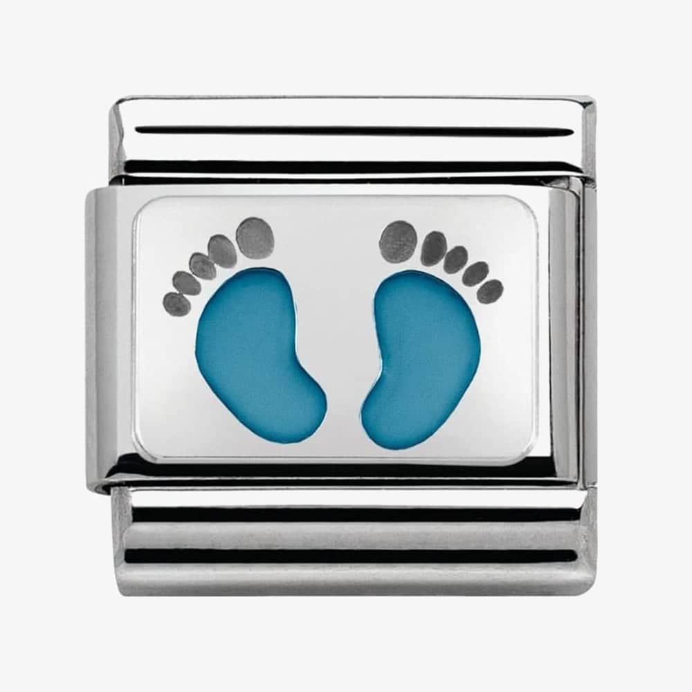 Featuring a simple set of small blue coloured enamel feet this design comes built into a stainless steel charm suitable for a Nomination bracelet.