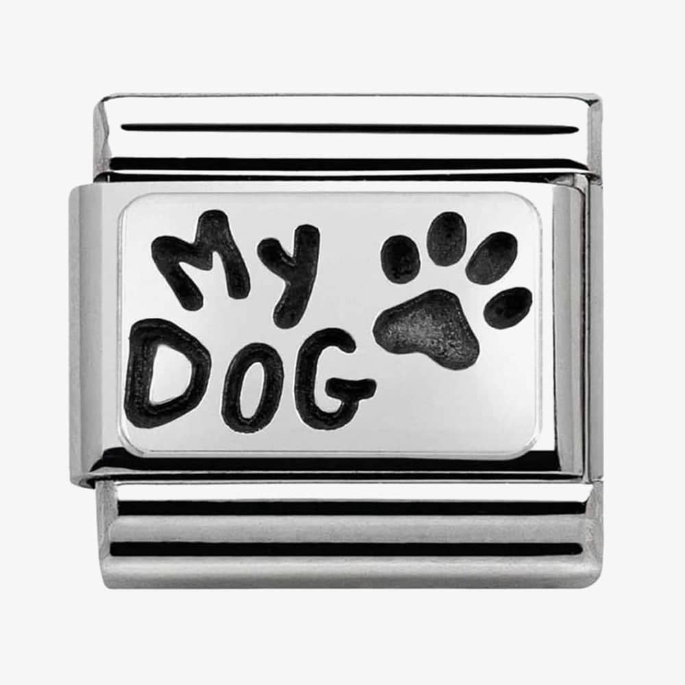 This stylish charm features a paw print design as well as the text "My Dog" made from black enamel detailing.
