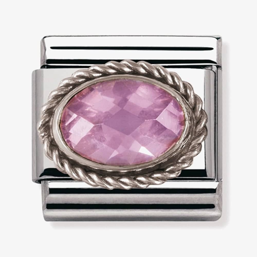 Give your Nomination bracelet a pretty pink sparkle with this attractive Ornate charm from the Classic range. The stainless steel base link is adorned with a beautifully faceted pink cubic zirconia with a wonderful ornate setting. A great gift for a loved one, to create a unique style statement.
