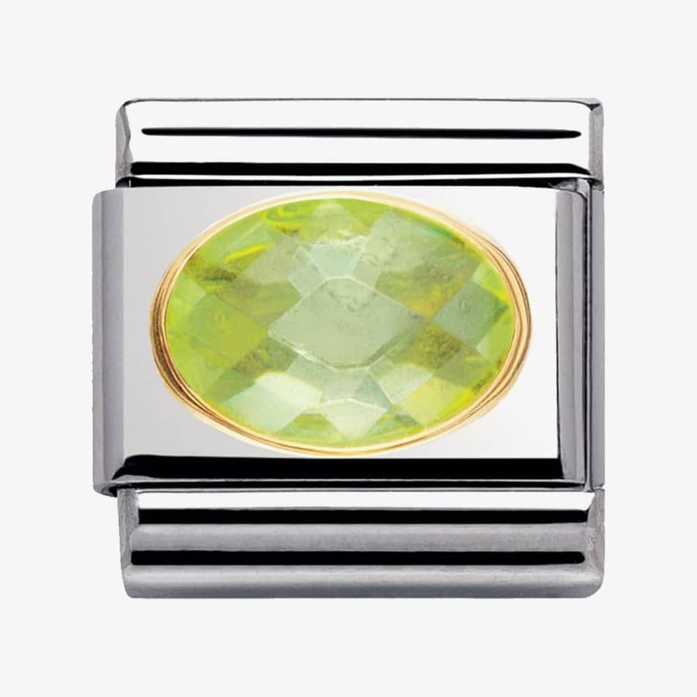 This is a stunning design from Nomination. Crafted from stainless steel, this piece will sit beautifully on any Nomination bracelet. The oval faceted cubic zirconia sits central to the piece, and is surrounded by a gorgeous strip of 18ct gold. This dazzling piece is sure to make a great gift for someone special.