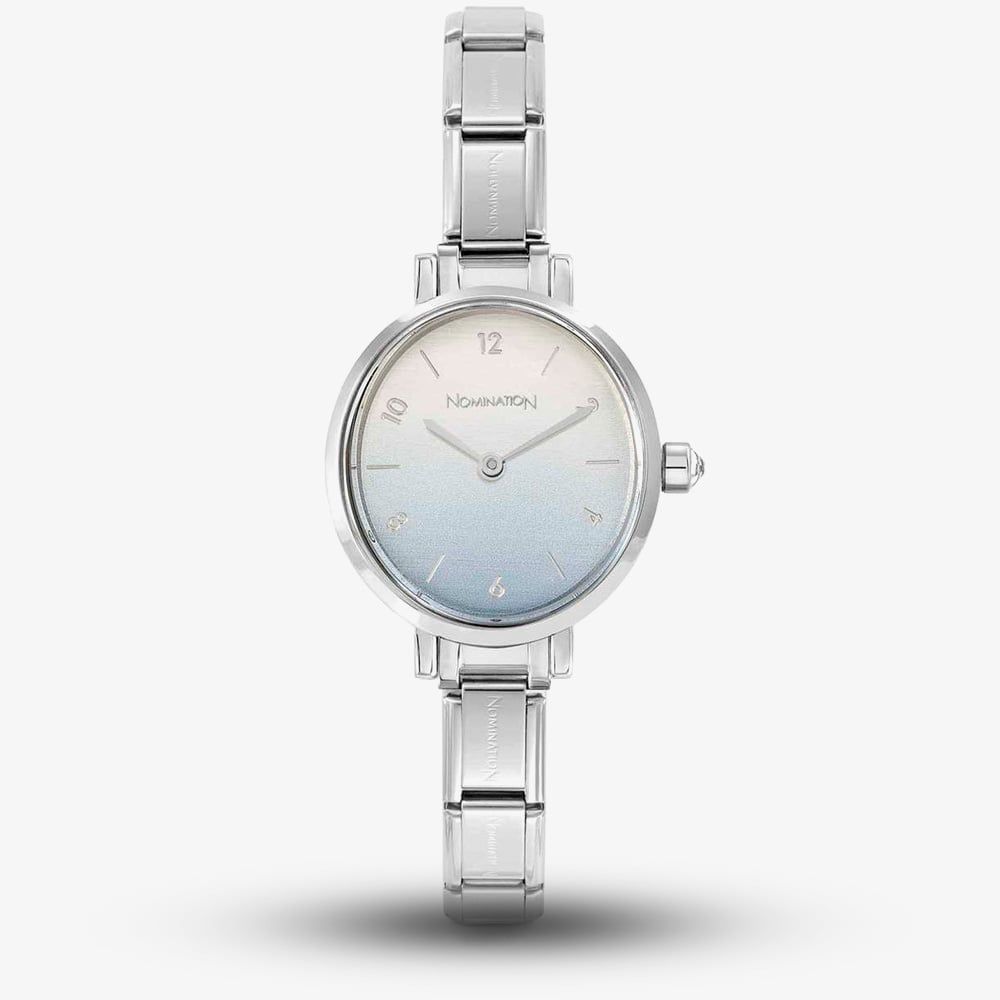 Elegant and contemporary, the Nomination Paris Watch features a polished silver-tone case with a round dial, highlighted by a smooth silver-to-blue ombré finish that adds a refined touch of colour. The coordinated silver-tone bracelet can be personalised with your favourite Nomination charms, making it easy to express your individual style.