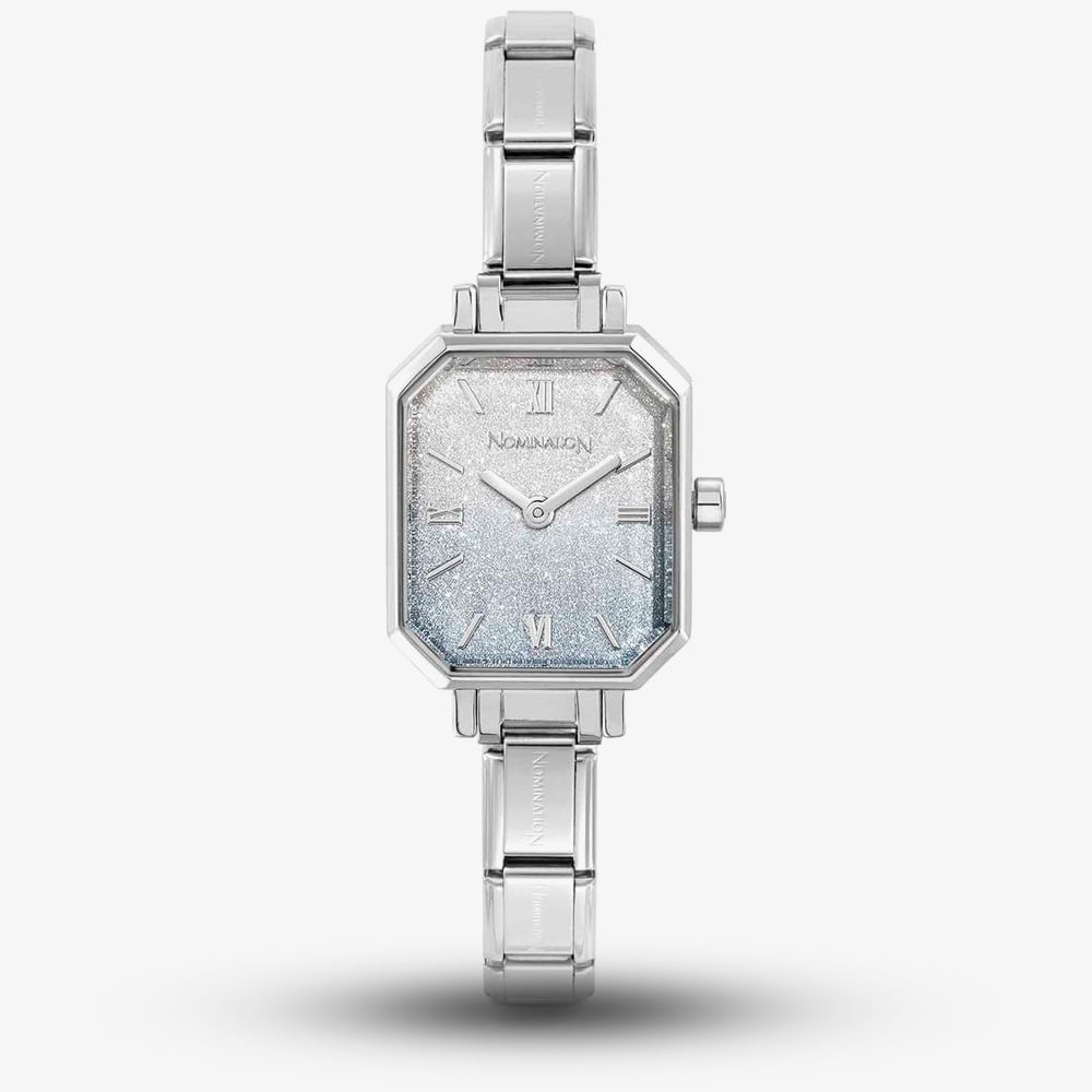 Chic and modern, the Nomination Paris Watch showcases a distinctive octagon-shaped silver-tone case and a captivating silver-to-blue ombré dial with a hint of glitter, offering just the right touch of sparkle. The sleek silver-tone bracelet is fully customisable with your favourite Nomination charms, letting you personalise your look with ease.