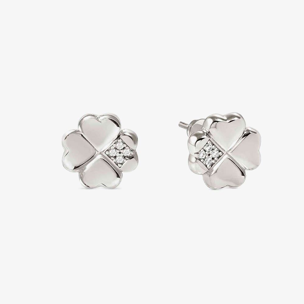 These delicate Petit Sparkle four leaf clover stud earrings by Nomination are crafted from high-quality sterling silver. Each clover features a unique contrast: one leaf is set with four sparkling white cubic zirconia stones, while the remaining leaves have a smooth, polished finish. A subtle symbol of luck and elegance, perfect for everyday wear or as a meaningful gift.