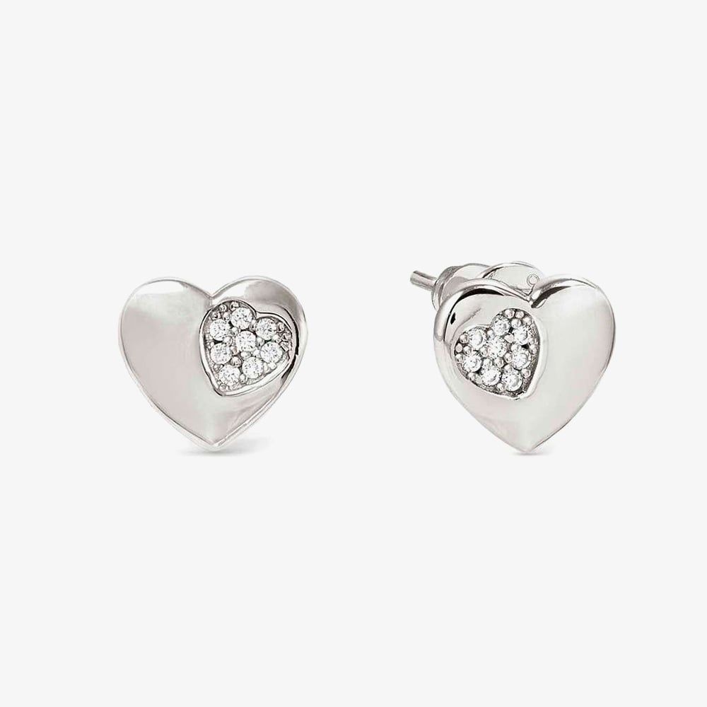 Crafted in polished sterling silver, these Nomination Petit Sparkle heart stud earrings feature a sleek outer heart frame with a smaller heart at the centre, beautifully filled with white cubic zirconia stones. Elegant and timeless, they add a touch of sparkle and romance to any look.