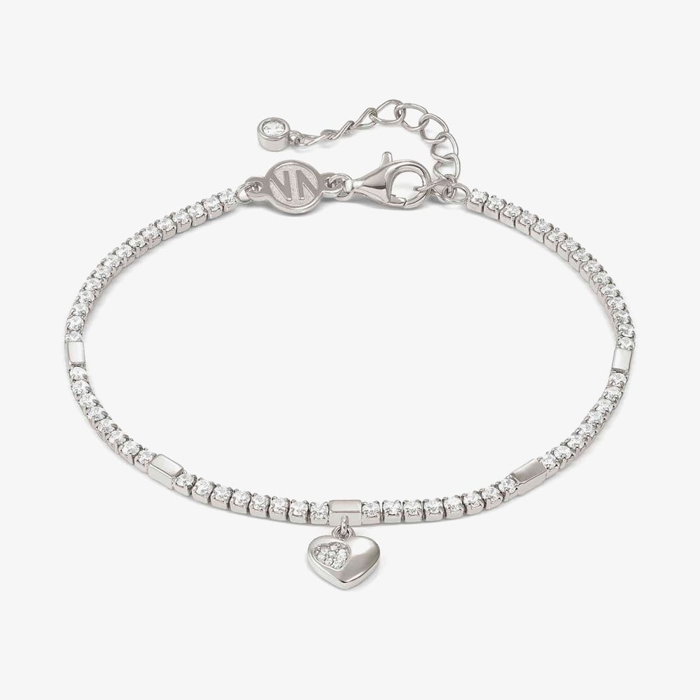 Exude timeless elegance with this sterling silver tennis bracelet from Nomination’s Petit Sparkle collection. Adorned with sparkling white cubic zirconia stones and accented by five sleek rectangular spacers, it also features a delicate heart charm for a subtle romantic touch. With an adjustable length, this sophisticated piece ensures a perfect fit and adds effortless style to any ensemble.
