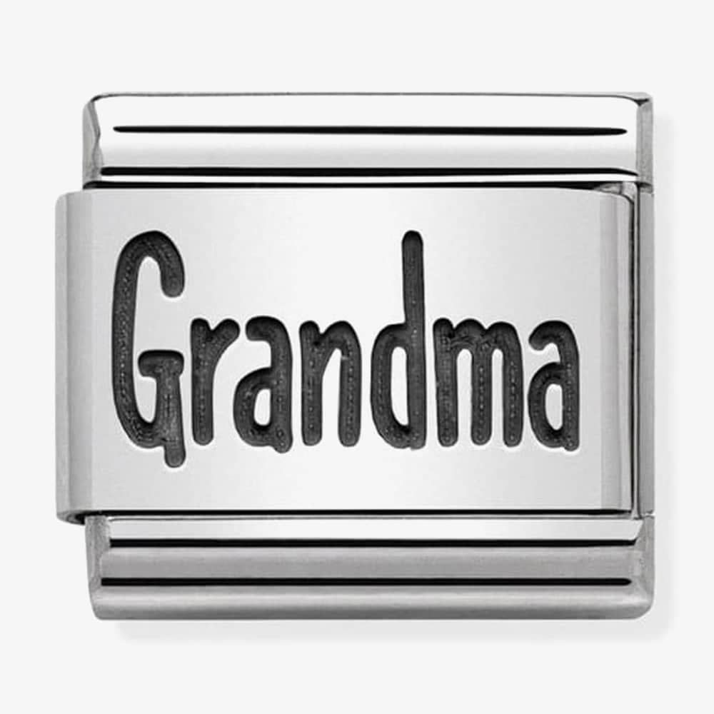 This eye-catching link charm from Nomination combines stainless steel with sterling silver and black enamel, creating an attractive aesthetic where the stylised writing spells out 'Grandma'.