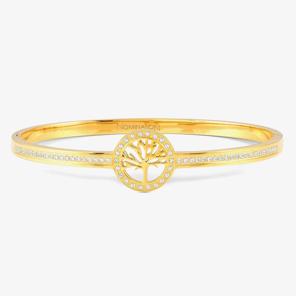 Adorn your wrist with elegance and sophistication with this yellow gold PVD plated stainless-steel bangle. Featuring a Tree Of Life motif at the front, the motif and bangle is outlined with sparkling white cubic zirconia, adding a touch of brilliance and glamour. This bangle is hinged on one side and has a hidden fastening that snaps securely on the other side.