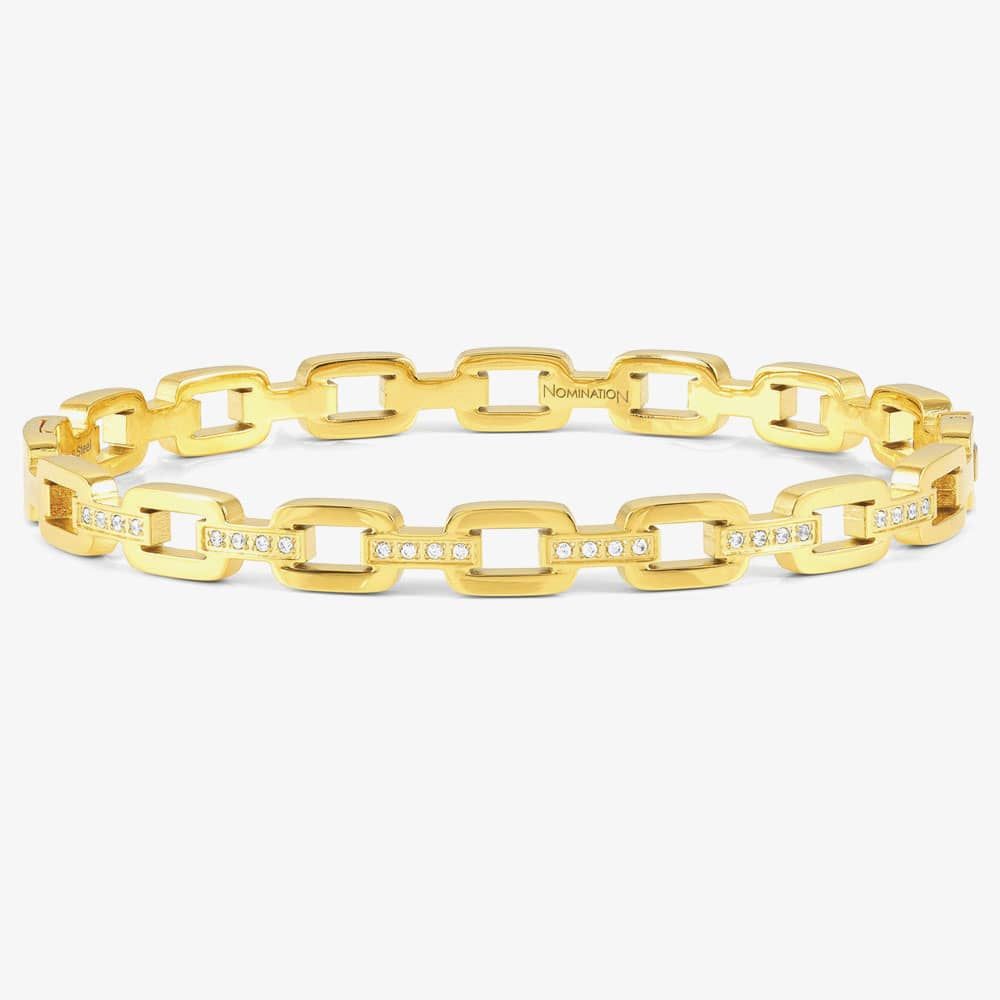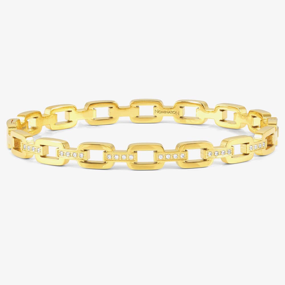 Adorn your wrist with the captivating allure of this yellow gold PVD plated stainless-steel bangle. Crafted with a sophisticated square link design encircling the entire bangle, it exudes modern elegance. Enhancing its charm, shimmering cubic zirconia grace every other link, adding a touch of sparkle and sophistication. This bangle is hinged on one side and has a hidden fastening that snaps securely on the other side.