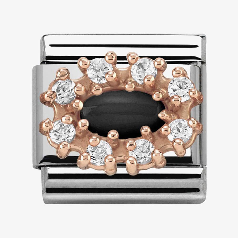 Adorn your favourite Nomination bracelet with this gorgeous stainless steel charm featuring a beautiful 9ct rose gold plated design finished with a black agate stone and further sparkling cubic zirconia. A wonderful charm perfect for creating a combination to truly suit your style.